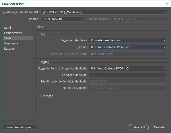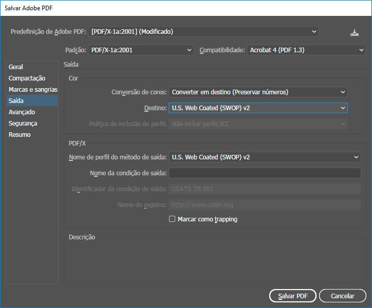 Tenha certeza de que na aba Saída a opção Destino esteja como U.S. Web Coated (SWOP) v2 e em seguida clique em Salvar PDF.
